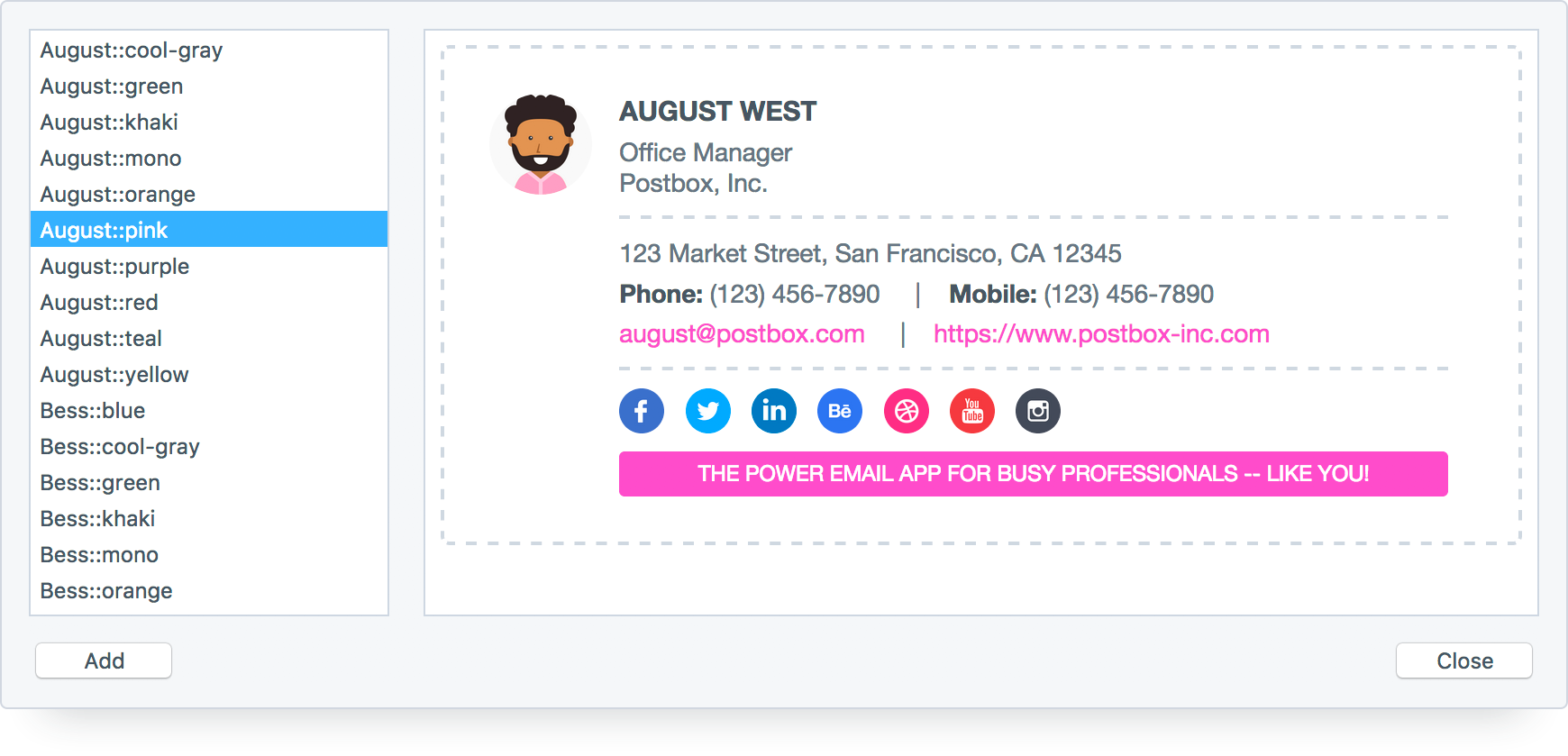 Postbox includes 25 beautifully designed email signatures that will present you in the best light possible. We've included designs of all shapes, colors, and sizes.
